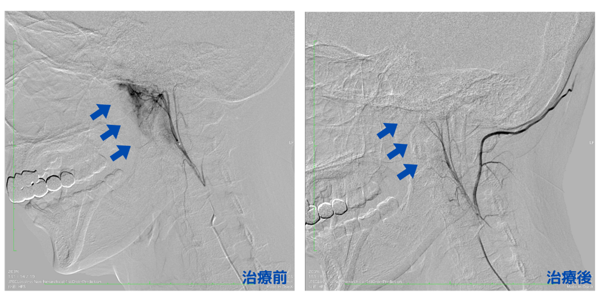 鼠径部からカテーテルを挿入し、上咽頭動脈まで慎重に進め炎症を抑える薬を流し治療をしました。治療は30分ほどで終了し、鼠蹊部の傷跡に絆創膏を貼って1時間ほどお休みいただいた後、ご帰宅いただきました。