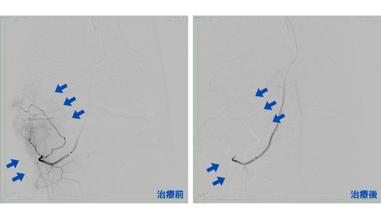 治療は、鼠径部から細いカテーテルを挿入し膝のモヤモヤ血管まで進め、そこに炎症を鎮める薬剤を直接流すことで、異常血管の炎症を鎮める治療を行いました。