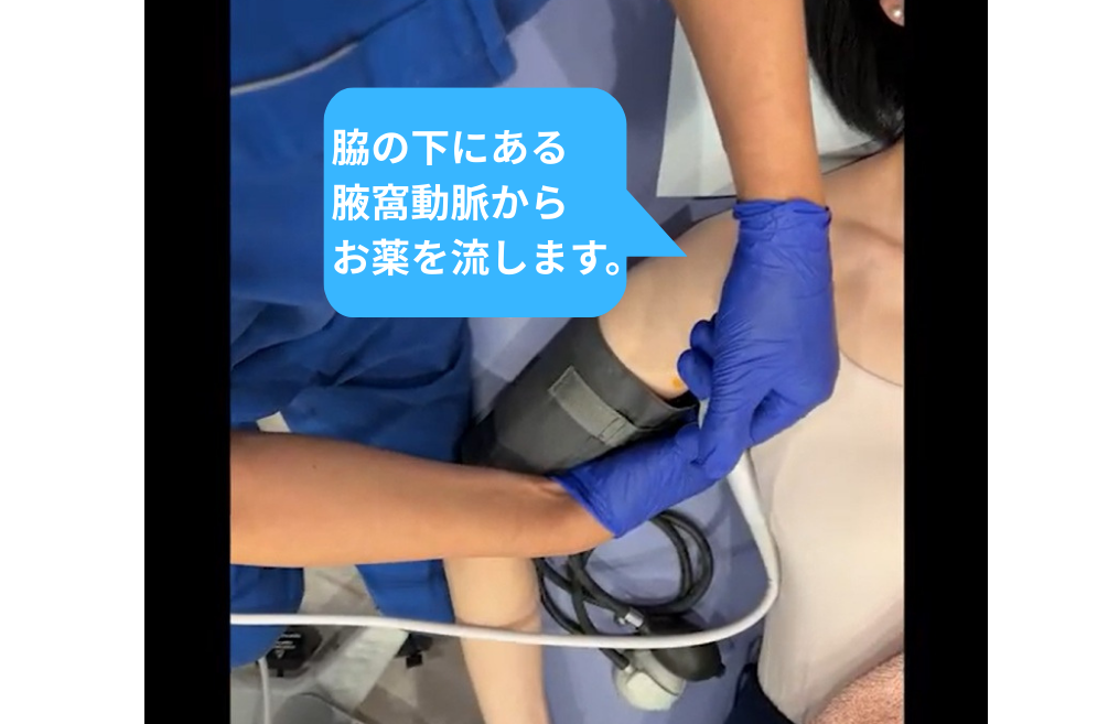 脇の下を走る「腋窩動脈(えきかどうみゃく)」から、非常に細い針を用いて炎症を抑える薬剤を投与します。(下記写真参照)薬は腋窩動脈から乳房へ向かう血管に流れ、痛みの原因となっているモヤモヤ血管に直接アプローチして治療する方法です。