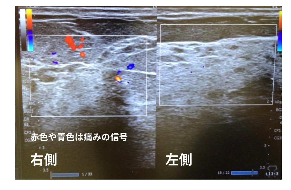 当院でエコーを使って詳しく診察したところ乳腺内にがんを疑う所見はありませんでしたが、特に右側の乳房において血管の信号が強く認められました。これは炎症が強く、本来は不要な血管「モヤモヤ血管」が増えていることを示しています。