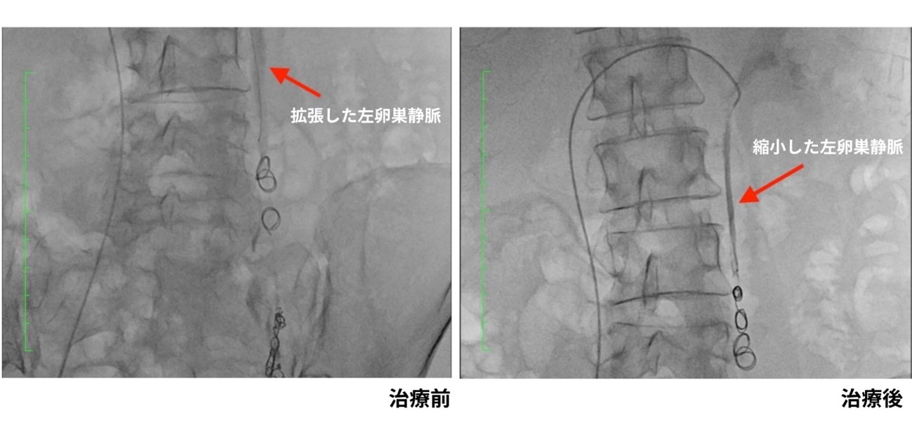 治療では、太ももの付け根から極細の柔らかいカテーテルを挿入し、逆流を起こしている左卵巣静脈に対して、コイルと薬剤(硬化剤)を用いて血液の逆流を止める処置を行いました。実際にカテーテルを通して造影すると、左卵巣静脈からの強い逆流が確認され、その血液が右側へも溢れ出している状態でした。治療は45分程度で終了し、1時間ほど休んでご帰宅いただきました。