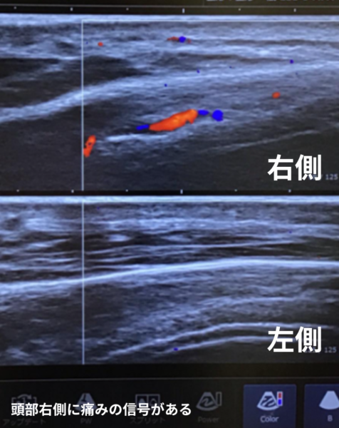 初診時に詳しくお話を伺い、超音波(エコー)のカラードップラ検査という血管を観察する検査を行ったところ、痛みを訴える右側の側頭部(頭蓋骨の外側)に、異常に拡張した血管「モヤモヤ血管」がはっきりと確認できました。一方で、痛みのない左側にはこのような血管の異常は見られませんでした。患部自体を押しても痛みはない状態でした。
