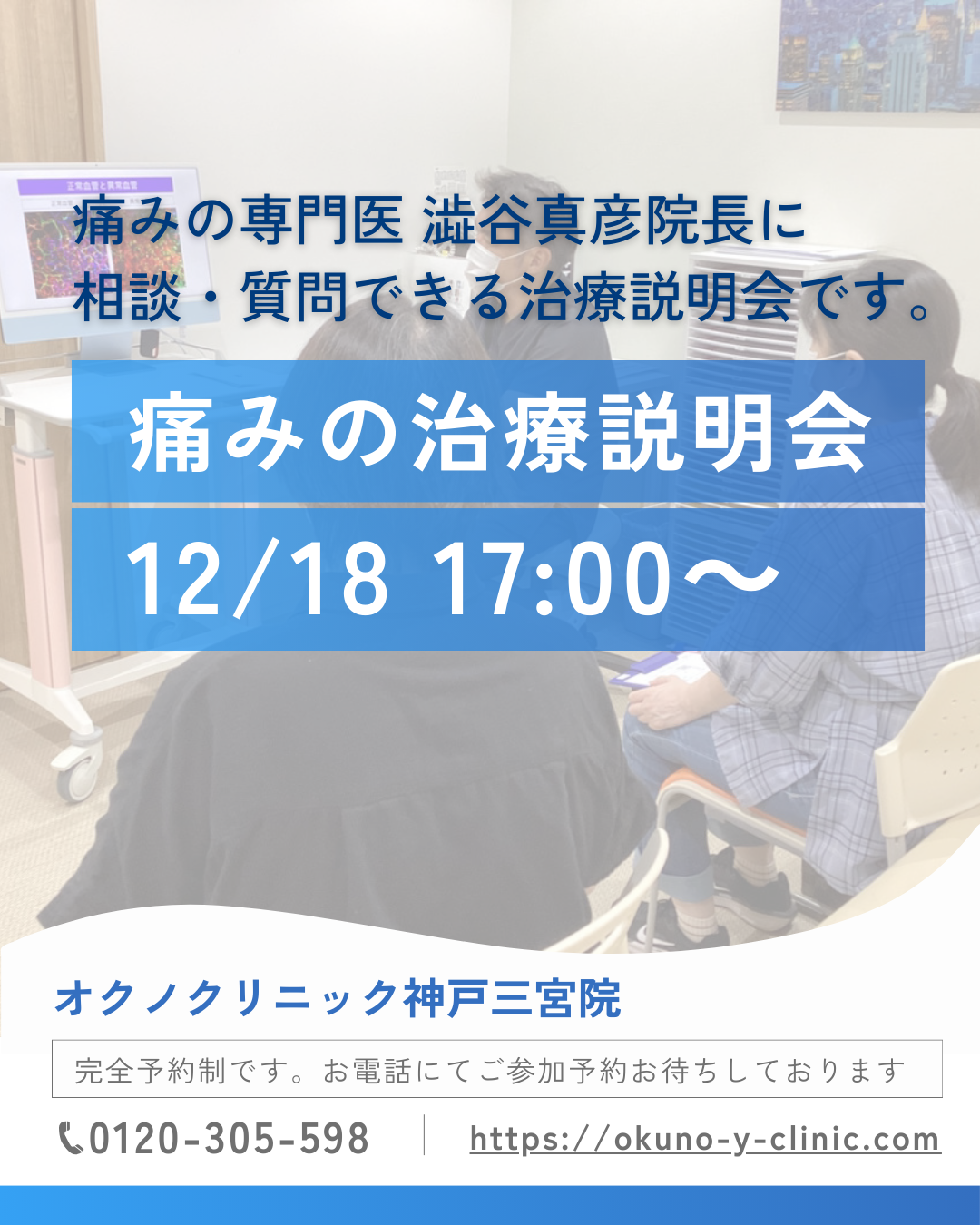 Okuno Clinic.で行う「運動器カテーテル治療」は肩こり、腰痛、五十肩、ひざ痛などへの長引<痛みに対する画期的な新しい治療法であり、メディアでも大き<取り上げられております。内覧会では、日頃から気になっていることや治療に関するご質問などお気軽にご相談ください。